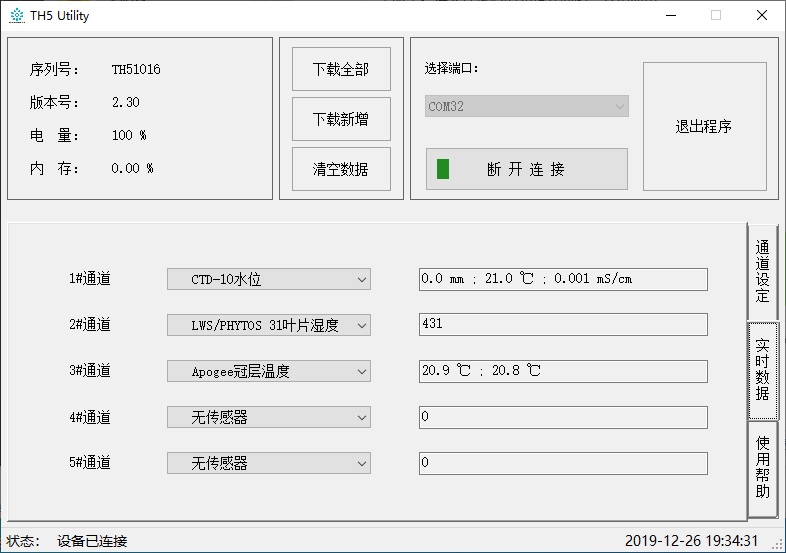 使用時,將傳感器插入數據采集器的任一接口,利用數據線將電腦與數據采集器連接,在TH5 Utility軟件界面中僅需設置一下數據記錄間隔與傳感器型號,無需復雜的編程。設置完成后斷開連接,儀器便開始工作。而且耗電量非常小,僅需5節5號電池供電,便可運行長達至少6個月的時間。